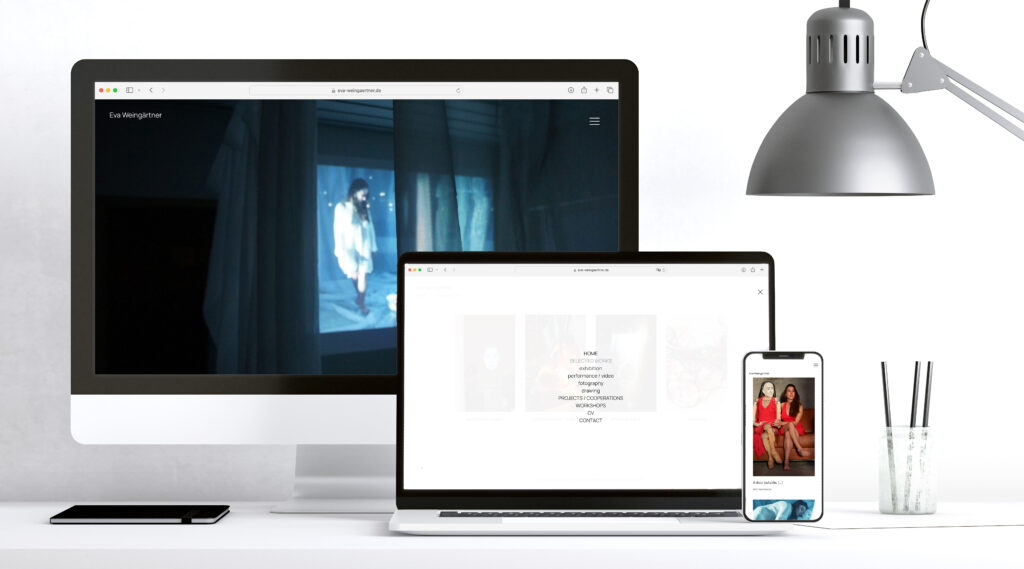 Auf der Startseite sind künstlerische Arbeiten der Werkgruppen Fotografie, Video und Installation gelistet. Detaillierte Informationen befinden sich einen klick tiefer.